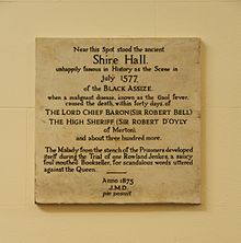 On the wall is a large marble plaque to commemorate the Black Assize. It was placed at the time of the erection of the Court in 1841 and is written in old English. Difficult to understand. It mentions the foul and saucy mouth of Rowland Jenkes and then goes on to mention some of those who died as a result of the curse, including all three Judges who tried his case.
